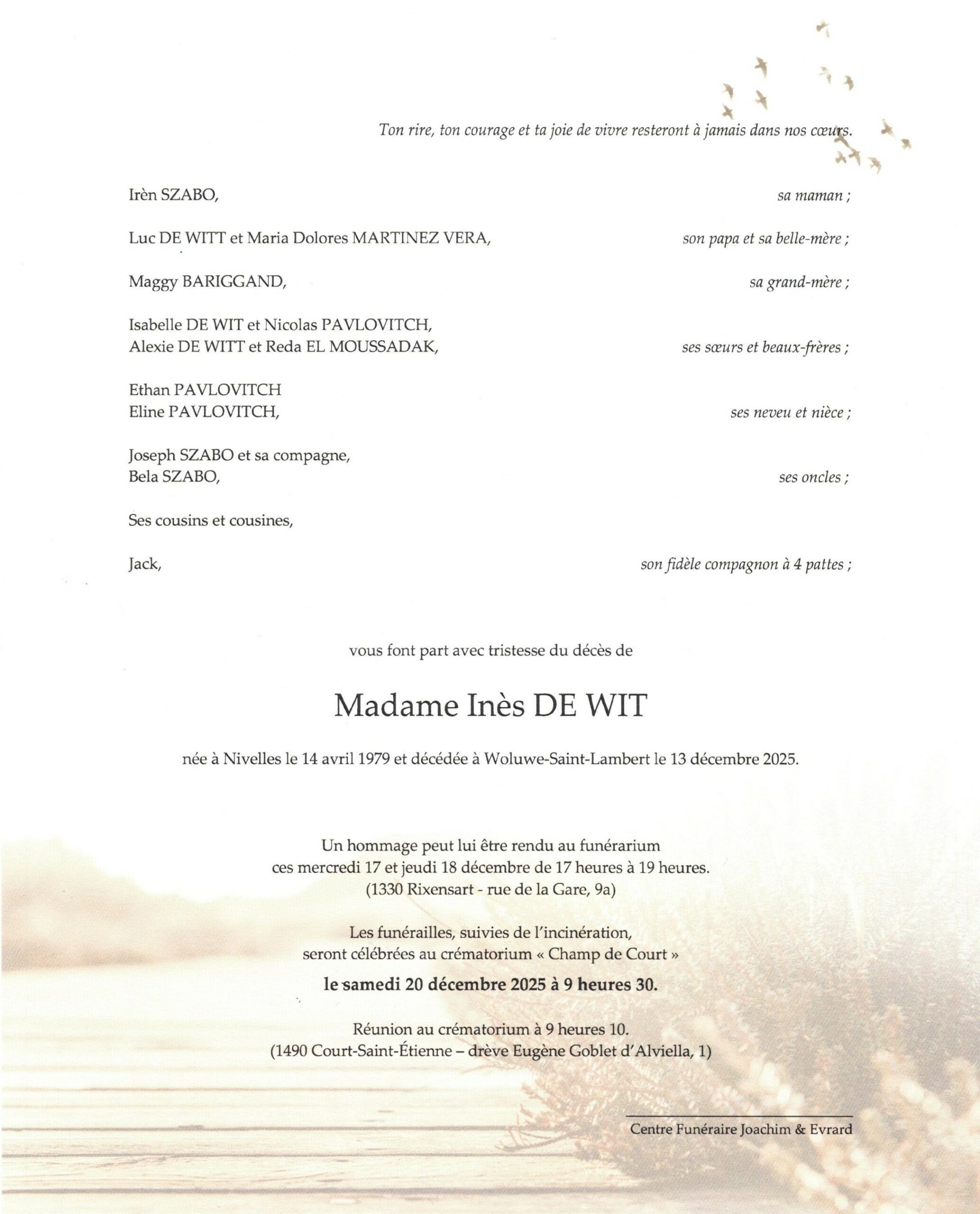 Le mardi 23 décembre 2025 au crématorium « Champ de Court » à Court-Saint-Etienne à 13 heures.