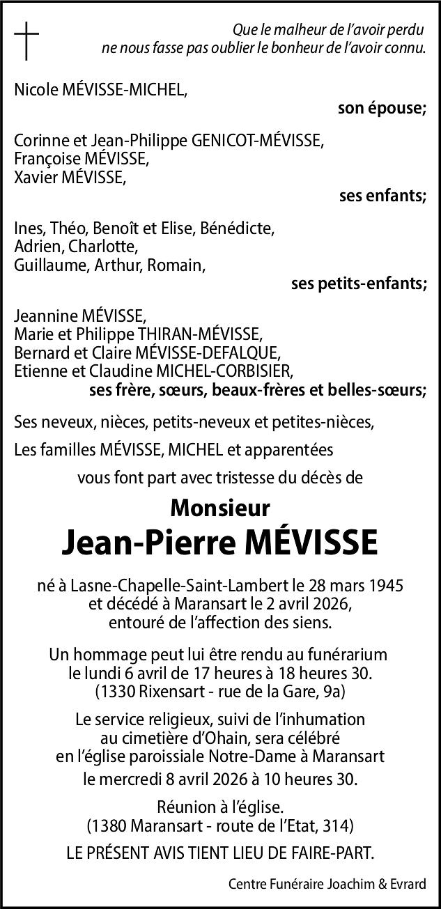 Le jeudi 9 avril 2026 en la salle du crématorium « Champ de Court » à Court-Saint-Etienne à 12 heures 30.